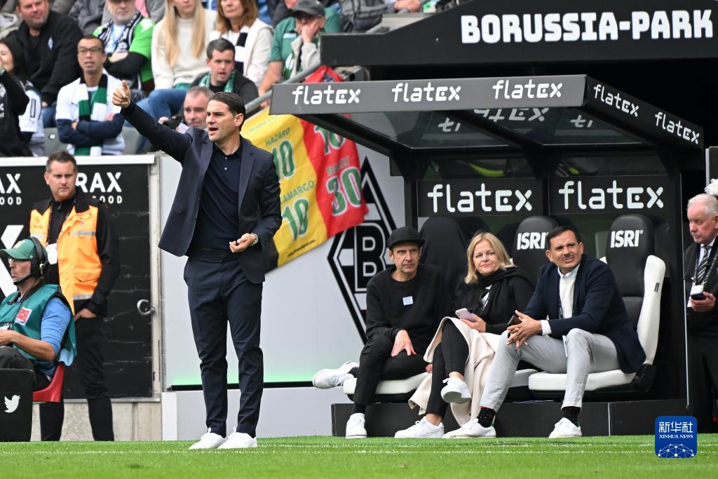 9月23日,门兴格拉德巴赫队主教练塞瓦内(左)在场边指挥。新华社发(乌尔里希·胡夫纳格尔 摄)
