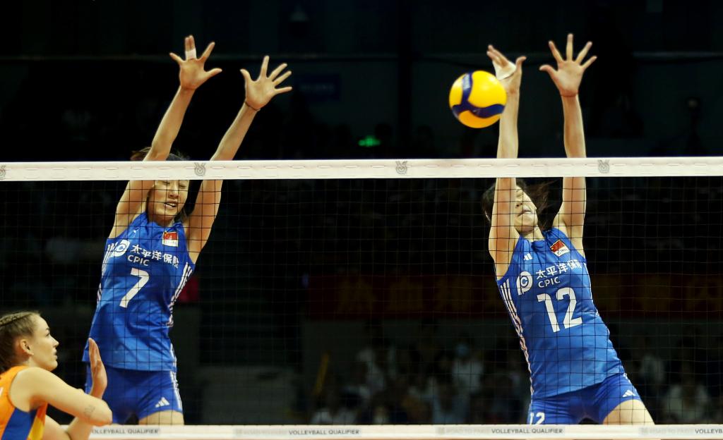 9月22日,中国队球员李盈莹(右)和王媛媛(中)在比赛中拦网。新华社发(索向鲁摄)