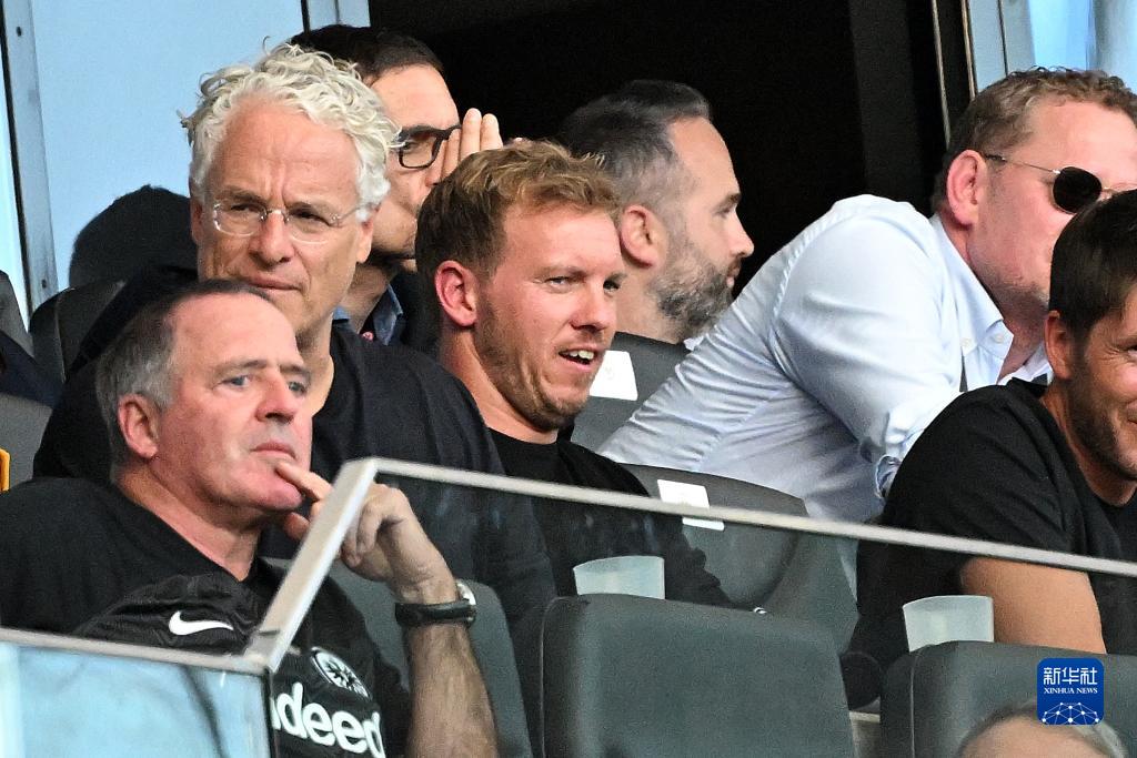 9月24日,新任命的德国国家队主教练尤利安·纳格尔斯曼(中)在看台观看比赛。新华社发(乌尔里希·胡夫纳格尔 摄)