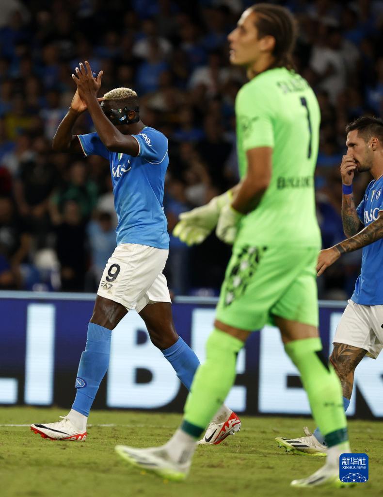9月27日,那不勒斯队球员奥斯梅恩(左)在比赛中攻入进球。新华社发(奥古斯托·卡萨索利摄)