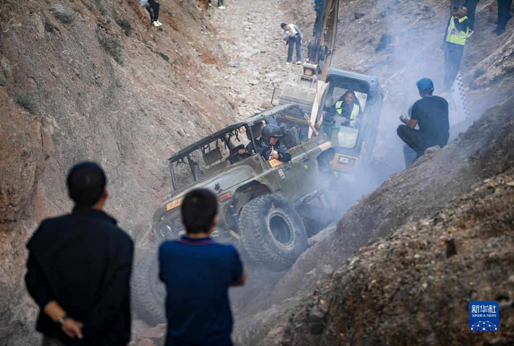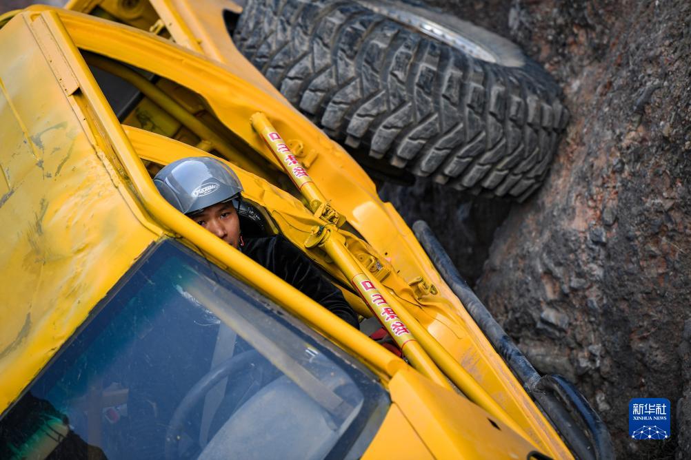 10月2日,L2量产改装组车手黄一根在佐罗之路赛道比赛中车辆出现故障,工作人员驾驶挖掘机进行救援。新华社记者 冯开华 摄