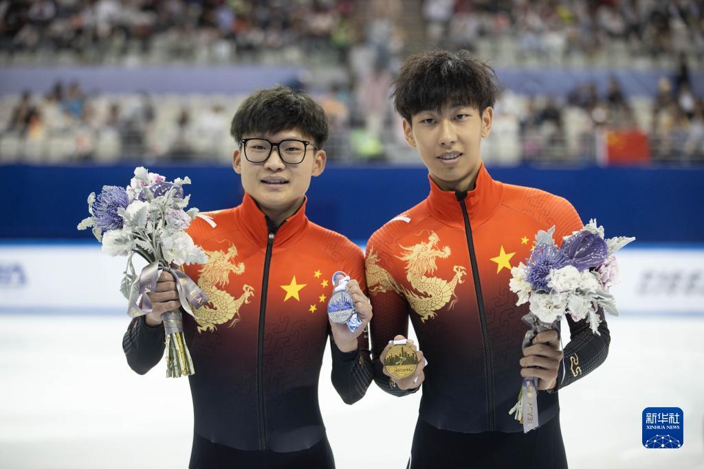 10月5日,中国选手孙龙(右)和钟宇晨颁奖仪式上合影。新华社记者 王翔 摄