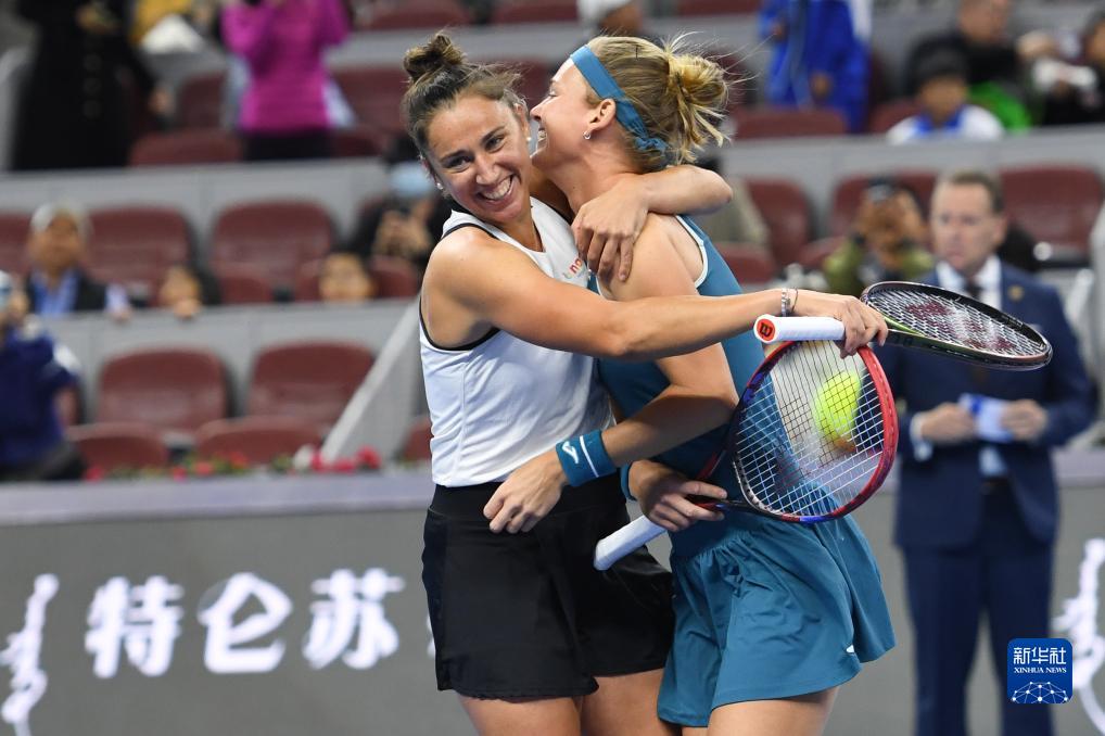10月8日,布兹科娃(右)/托莫组合在比赛结束后庆祝胜利。新华社记者 鞠焕宗 摄
