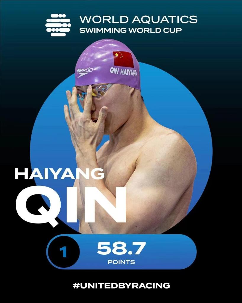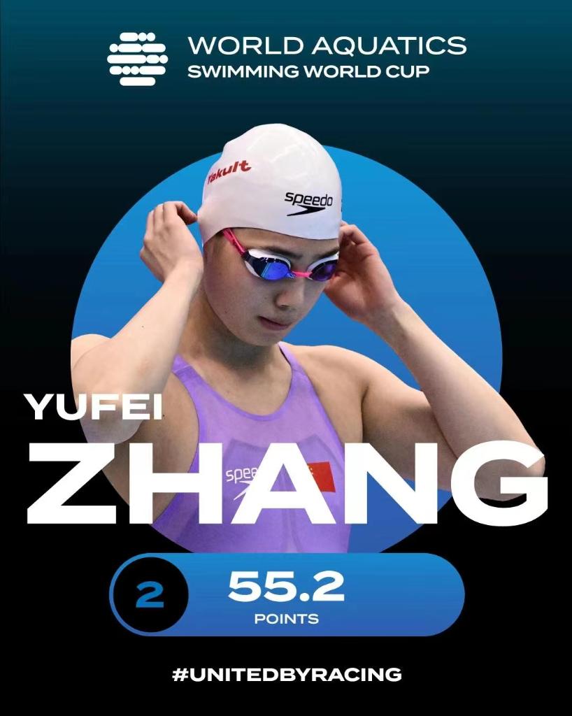 何诗蓓则以52秒02的成绩改写她9月底在杭州亚运会创造的女子100米自由泳亚洲纪录52秒17,成为该项目历史上第三快的选手,她还收获了200米自由泳金牌和400米自由泳铜牌,在积分榜列第三名。