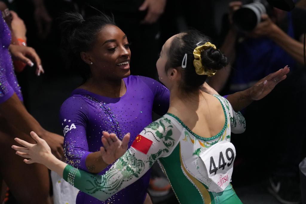 10月8日,拜尔斯(左)完赛后与即将上场的周雅琴拥抱致意。新华社记者 郑焕松 摄