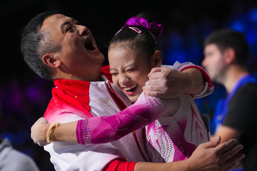 10月7日,中国选手邱祺缘(右)在女子高低杠决赛后与教练拥抱庆祝。新华社记者 郑焕松 摄