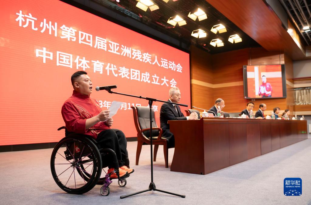 当日,杭州第四届亚洲残疾人运动会中国体育代表团成立大会在北京中国残疾人体育运动管理中心举行。