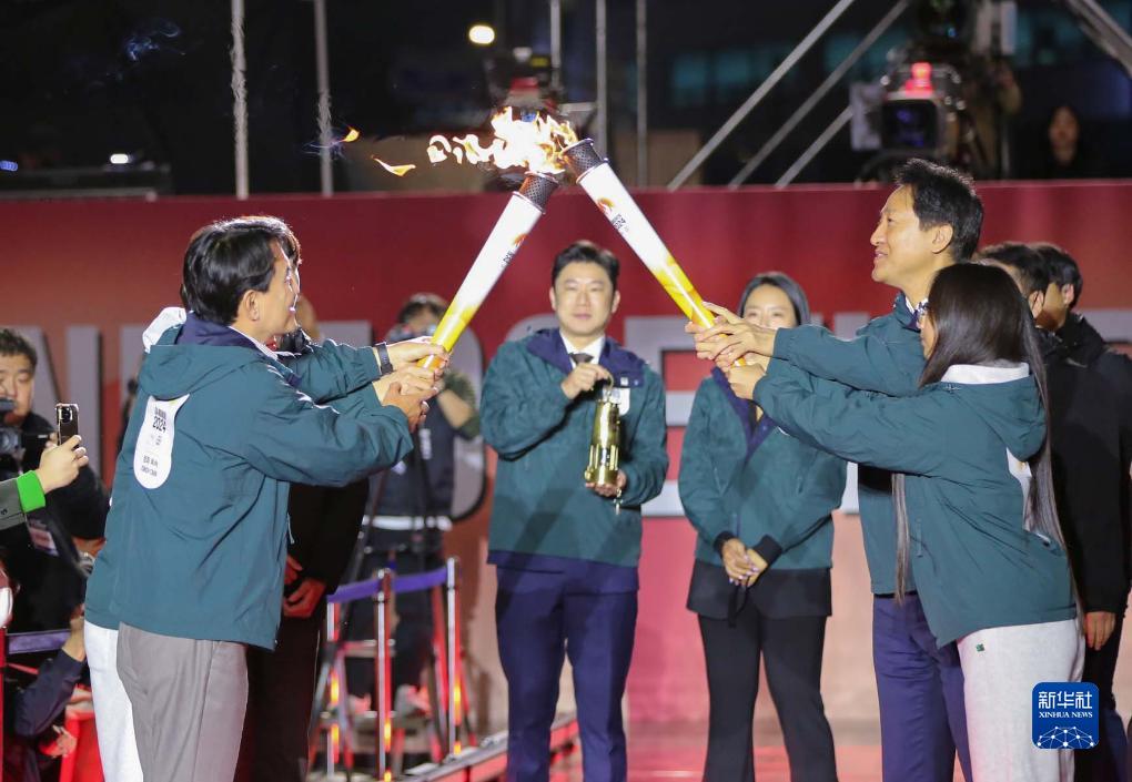 10月11日,首尔市长吴世勋(左)参与火炬传递。新华社记者姚琪琳摄