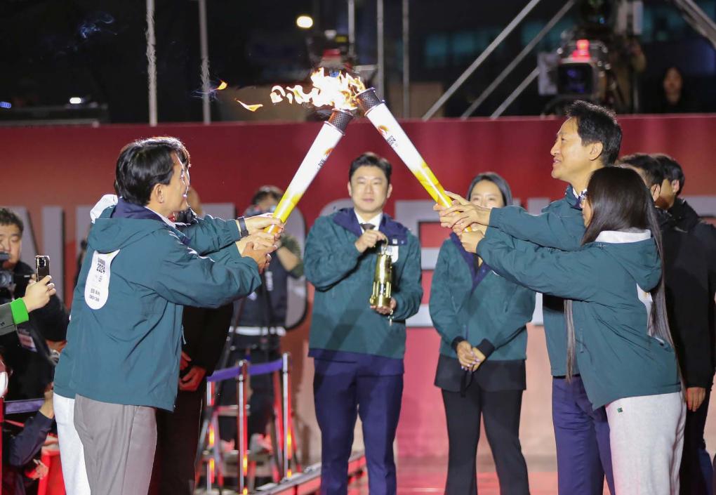 10月11日,首尔市长吴世勋(右二)与江原道知事金镇台(前左一)参与火炬传递。新华社记者姚琪琳摄