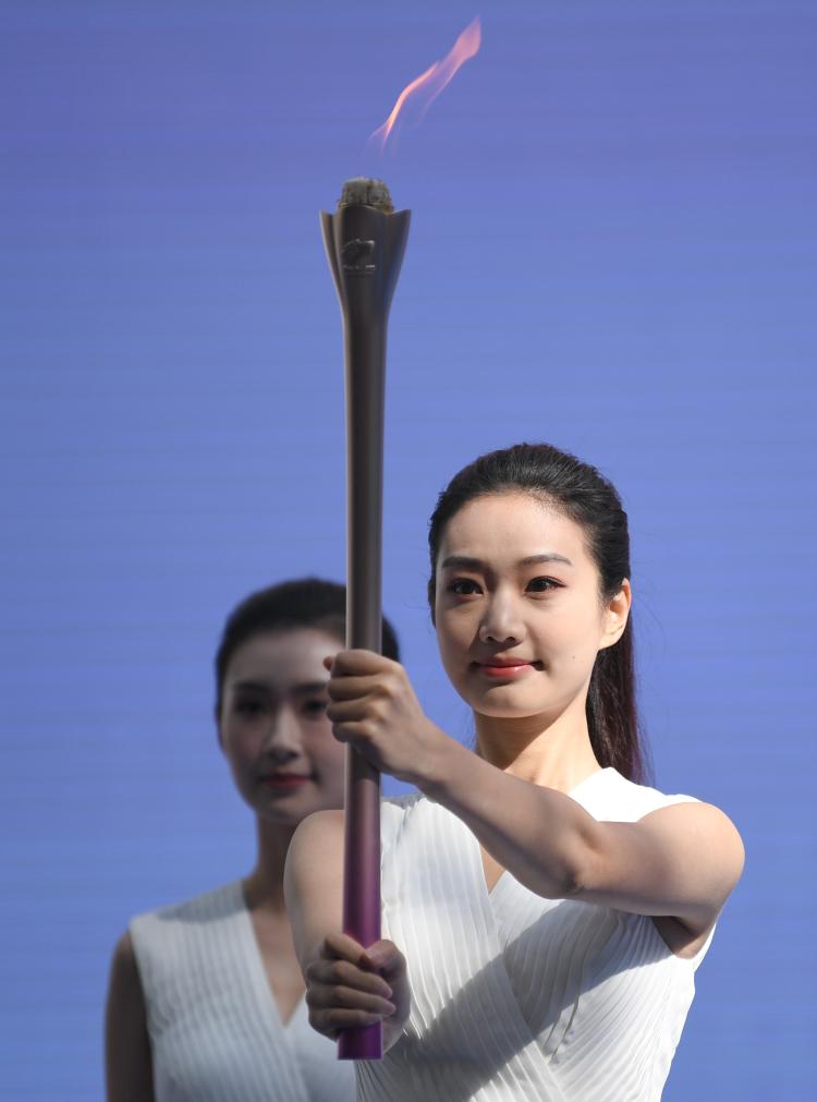 10月12日,采火使者在采集仪式上展示引燃的采火棒。新华社记者 邓华 摄