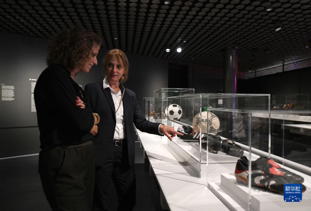 10月12日,在瑞士苏黎世国际足联博物馆,工作人员在“设计美丽足球”展览的揭幕仪式上介绍展品。新华社记者 连漪 摄