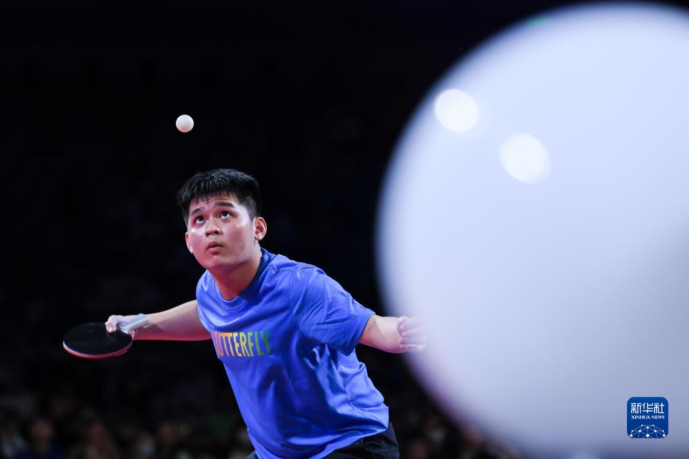 10月13日,林诗栋在比赛中回球。新华社记者 李博 摄