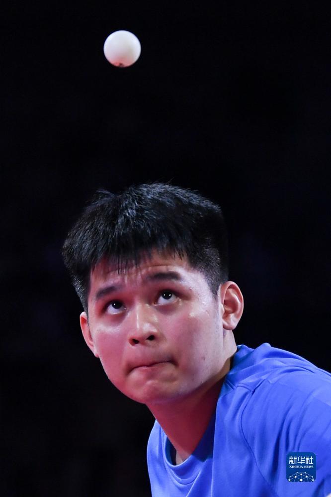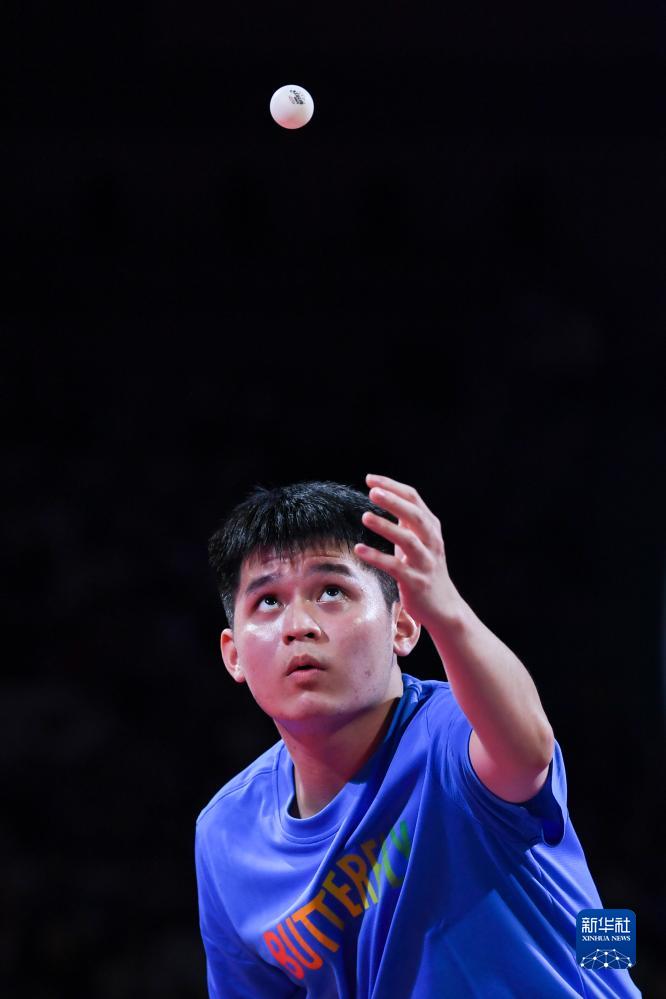 10月13日,林诗栋在比赛中发球。新华社记者 李博 摄