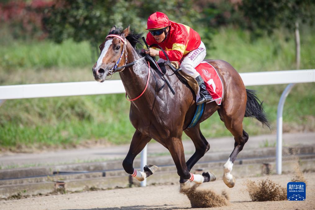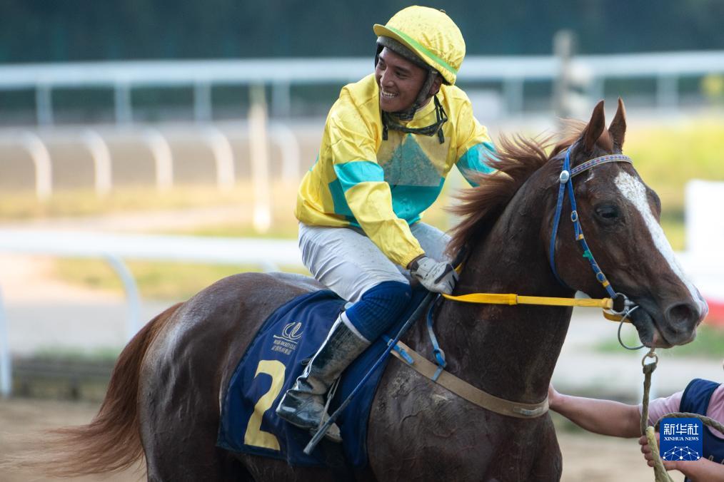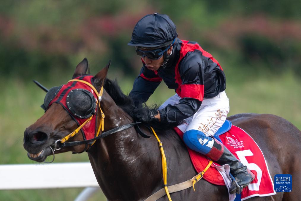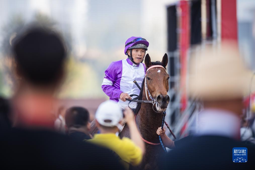 10月15日,骑师陆江峰驾驭赛马在4岁及以上纯血马1000米的比赛中。最终,他获得本组冠军。新华社发(杜子璇摄)
