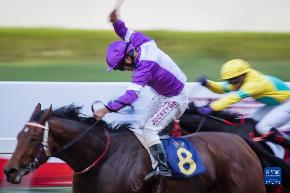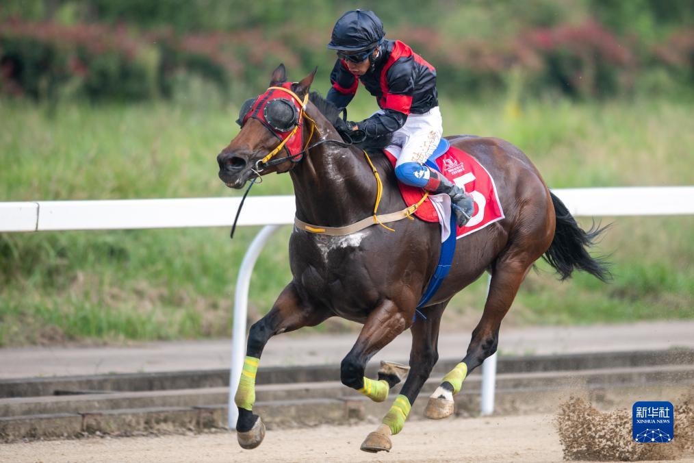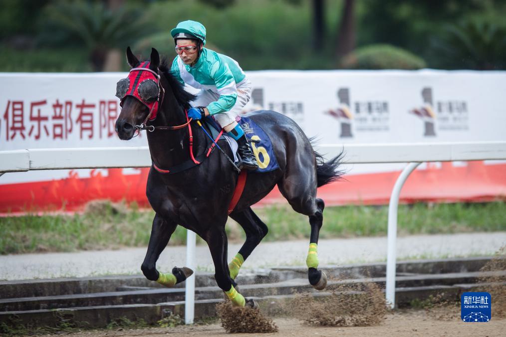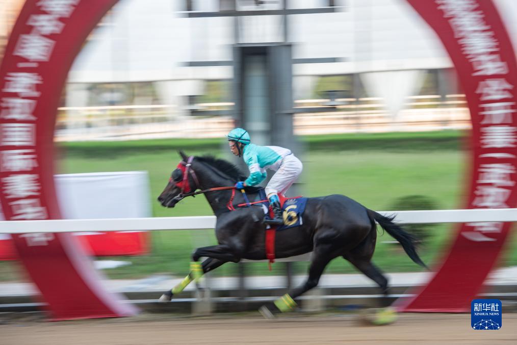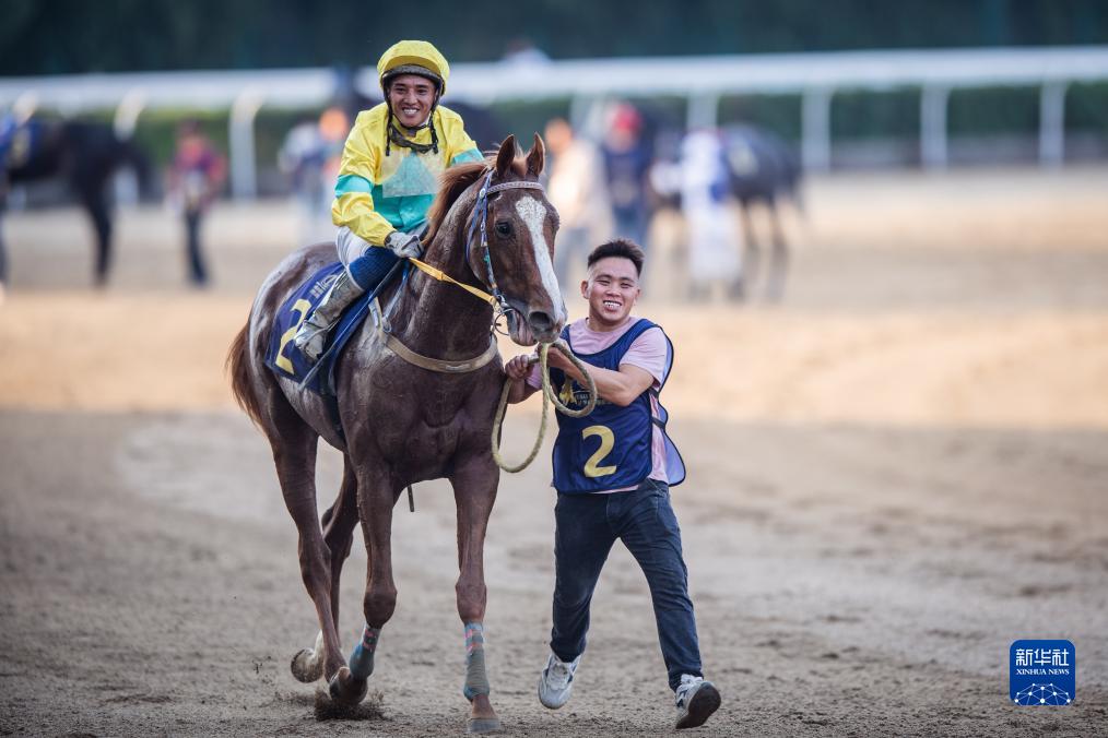 10月15日,骑师陆江峰驾驭赛马在4岁及以上纯血马1000米的比赛中。最终,他获得本组冠军。新华社发(杜子璇摄)
