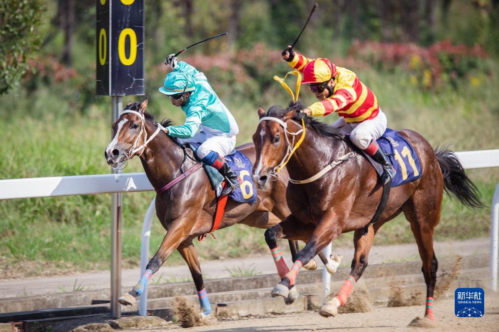 10月15日,骑师初一(右)驾驭赛马在3岁中国出生纯血马1000米的比赛中。新华社发(杜子璇摄)
