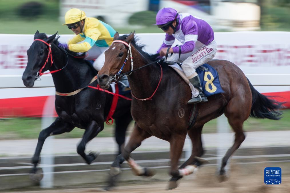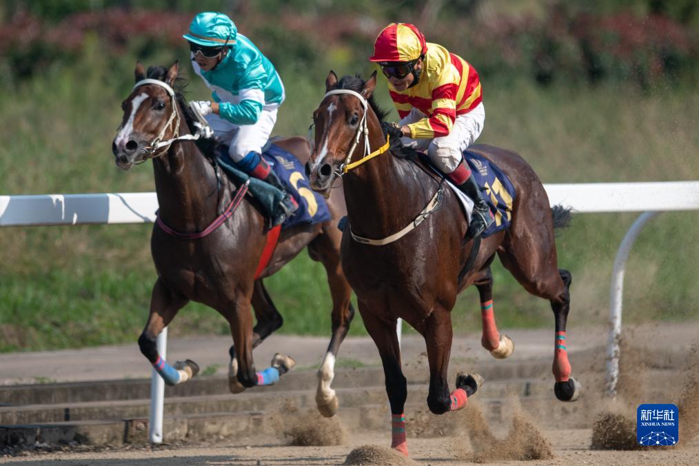 10月15日,骑师王文勋(左)驾驭赛马在3岁中国出生纯血马1000米的比赛中。新华社记者 伍志尊 摄