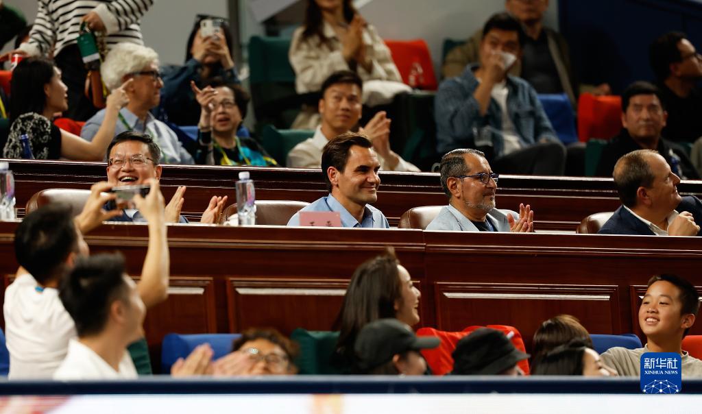 10月15日,费德勒(二排左二)观看本场比赛。新华社记者 王丽莉 摄