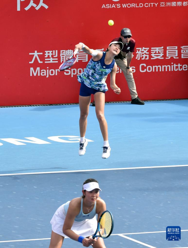 10月15日,汤千慧(上左)/曹家宜在比赛中。新华社记者 卢炳辉 摄