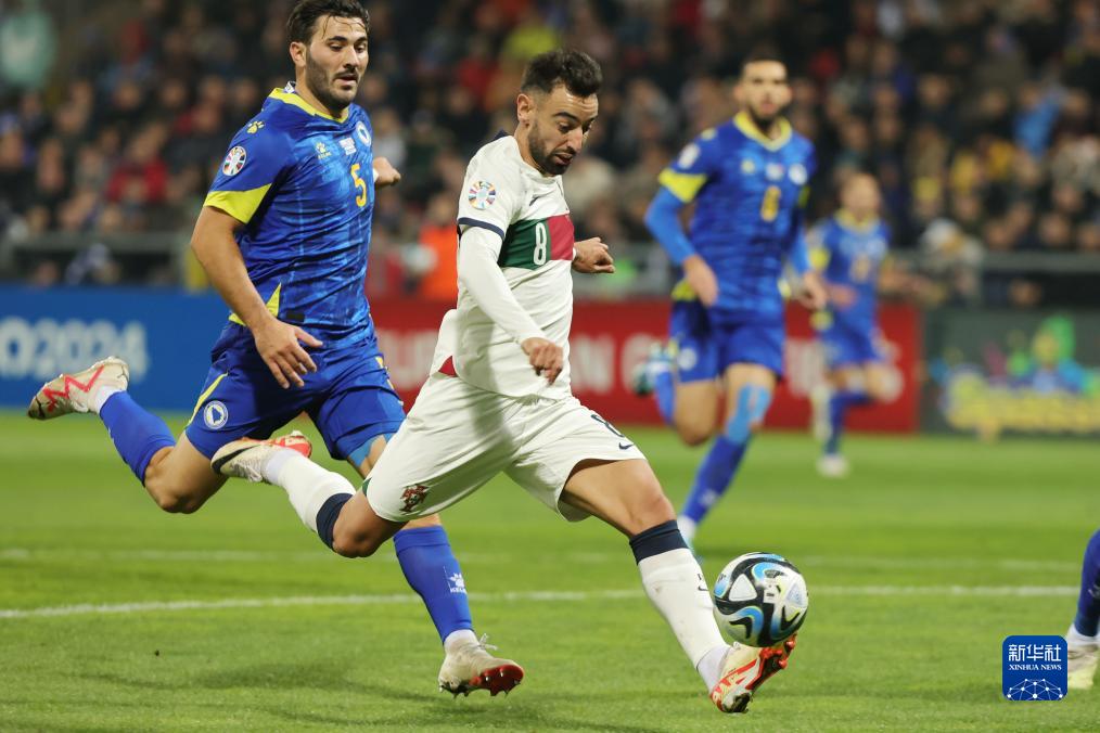 10月16日,葡萄牙队球员布鲁诺·费尔南德斯(右)在比赛中带球突破。新华社发(埃尔明摄)