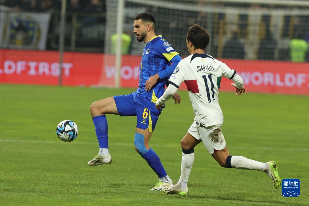 10月16日,波黑队球员巴里希奇(左)和葡萄牙队球员菲利克斯在比赛中拼抢。新华社发(埃尔明摄)