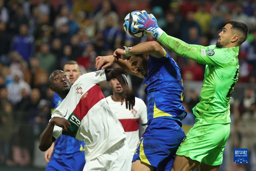 10月16日,波黑队球员科拉西纳茨(前中)在比赛中与葡萄牙队守门员迪奥戈·科斯塔(前右)、球员达尼洛·佩雷拉拼抢。新华社发(埃尔明摄)