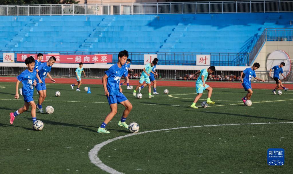 10月18日,长兴县龙山中学体教融合班的学生在完成了文化课学习后,在操场上进行足球训练。新华社记者 徐昱 摄