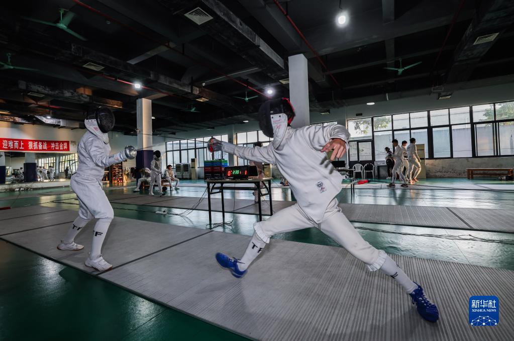 10月18日,长兴县龙山中学体教融合班的学生进行击剑训练。新华社记者 徐昱 摄