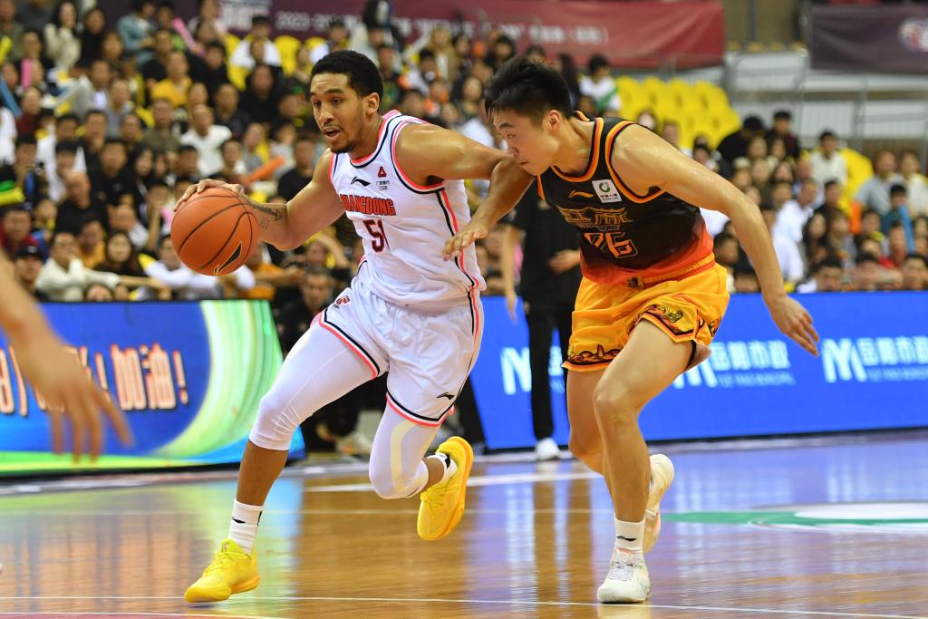 10月14日,广东队球员沃特斯(左)在江苏队球员陶彦儒的防守下突破。当日,在湖南岳阳举行的2023-2024中国男子篮球职业联赛(CBA)季前赛中,广东队以92:91战胜江苏队。新华社记者 陈振海 摄