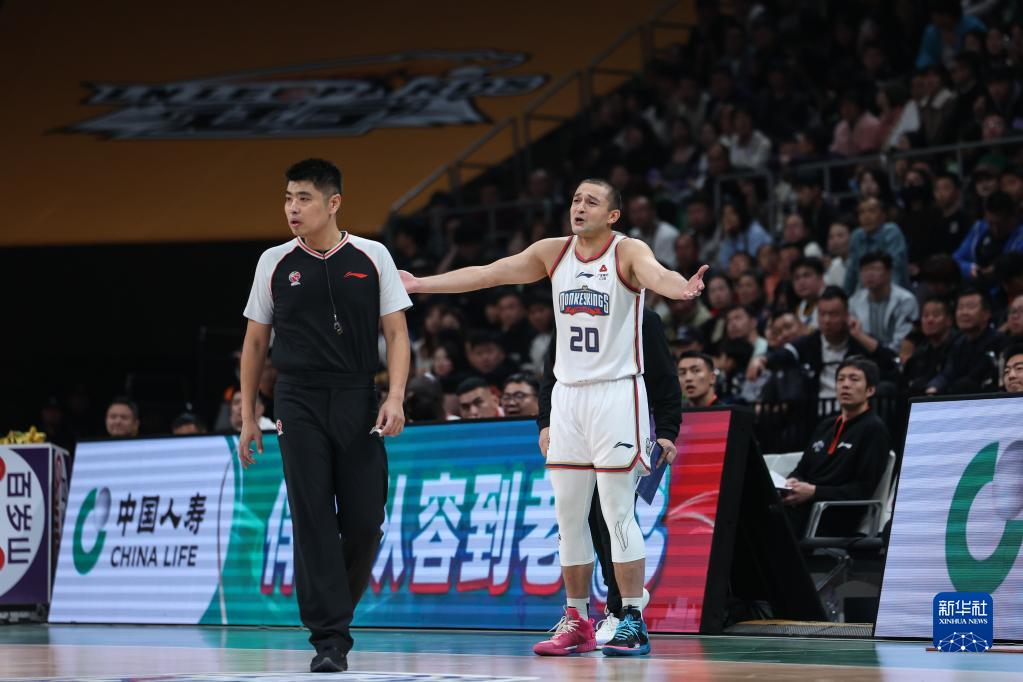 10月21日,南京头排苏酒队主教练兼球员西热力江(右)在比赛中与裁判沟通。新华社记者 潘昱龙 摄