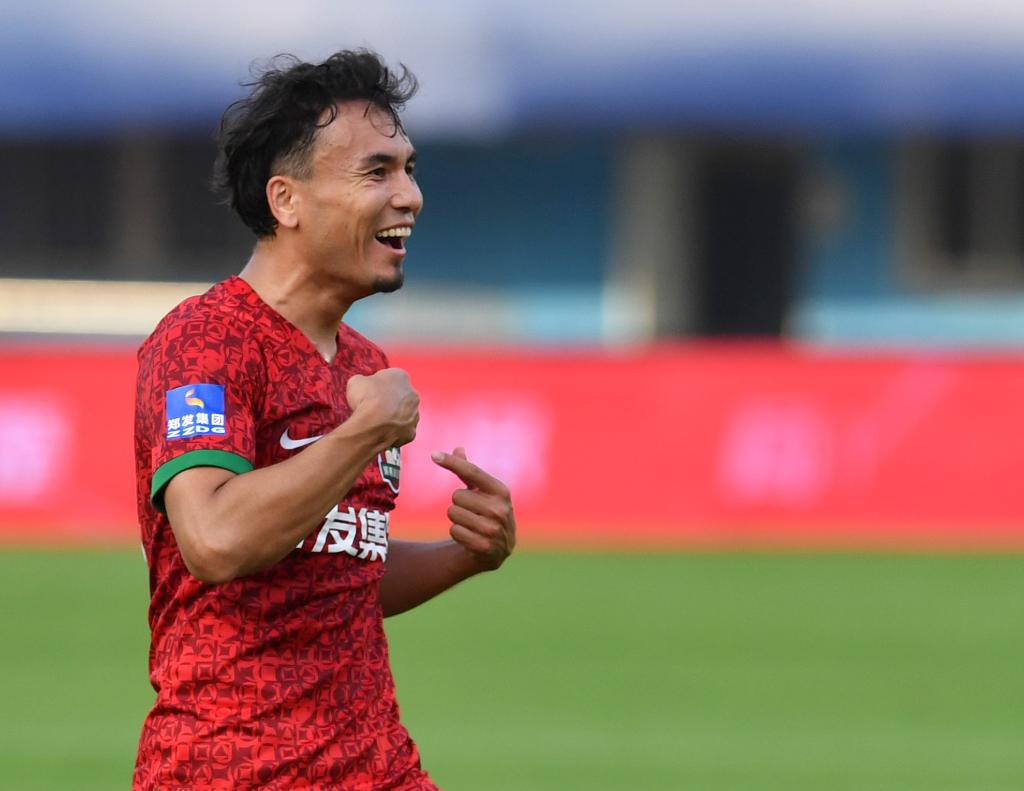 10月21日,河南队球员迪力穆拉提·毛拉尼牙孜在比赛中庆祝进球。新华社记者 李嘉南 摄