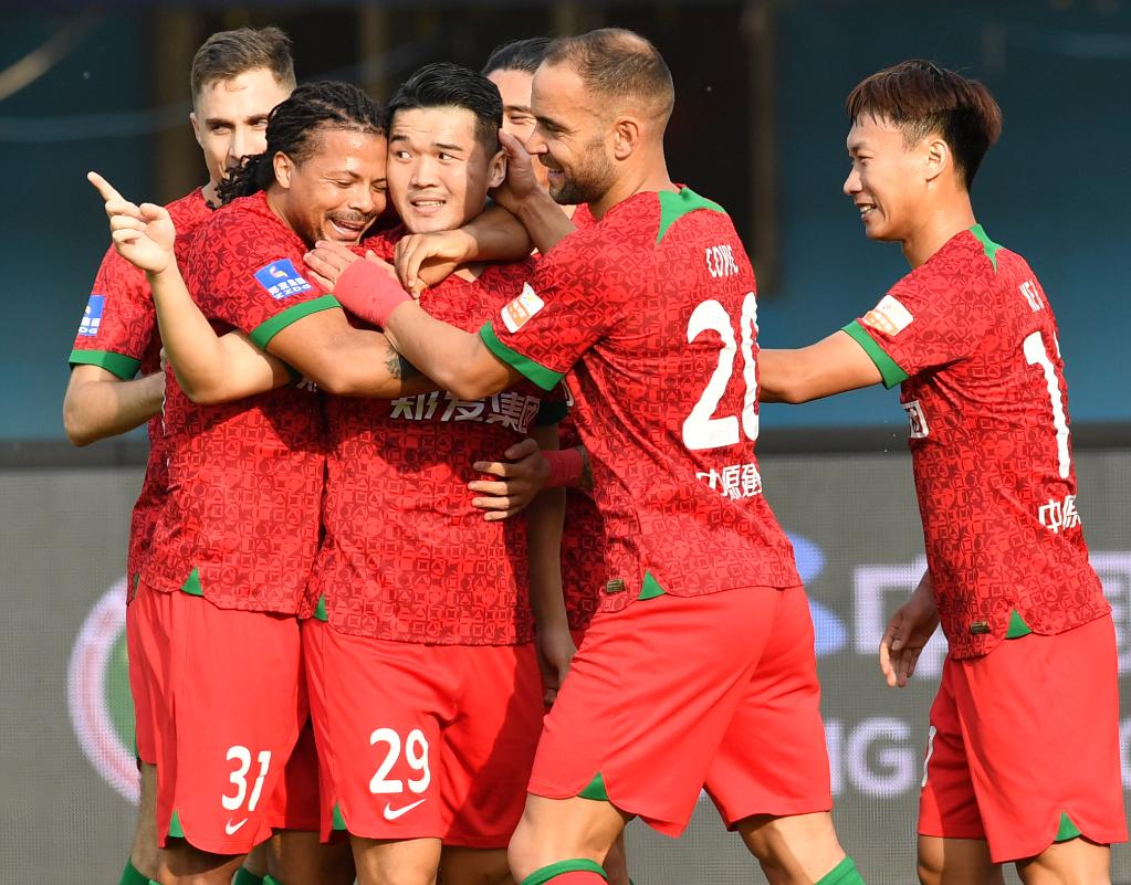 10月21日,河南队球员钟义浩(左三)在比赛中与队友庆祝进球。新华社记者 李嘉南 摄