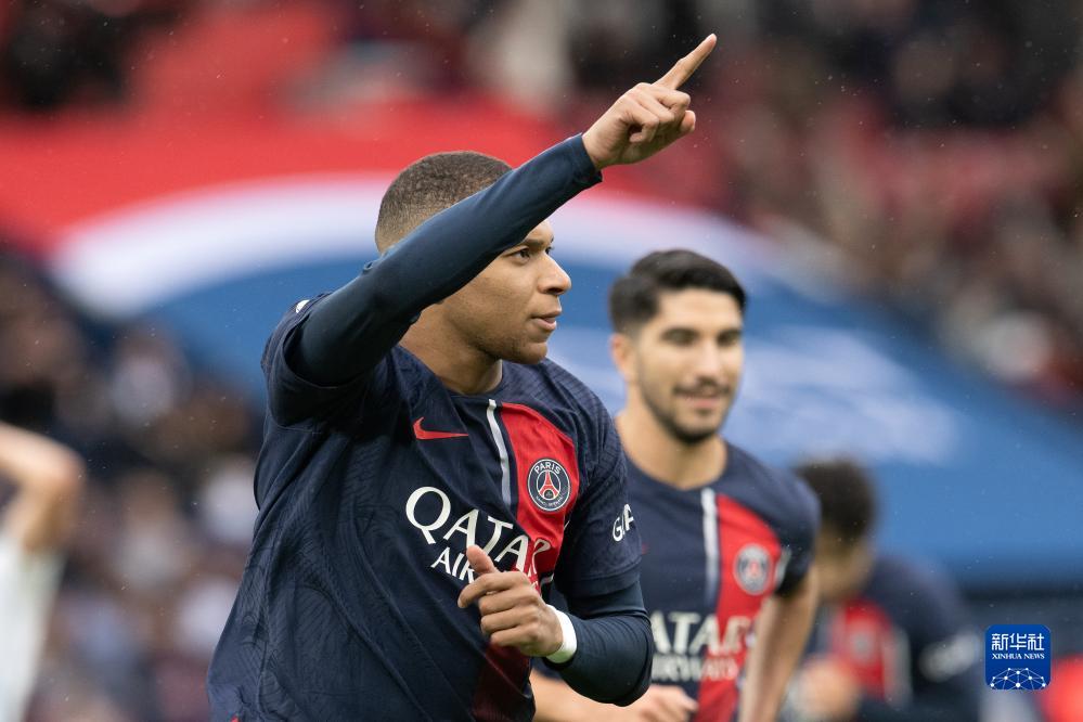10月21日,巴黎圣日尔曼队球员姆巴佩(左)庆祝进球。新华社发(杰克·陈摄)