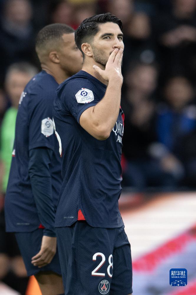 10月21日,巴黎圣日尔曼队球员鲁伊斯在比赛中庆祝进球。新华社发(杰克·陈摄)
