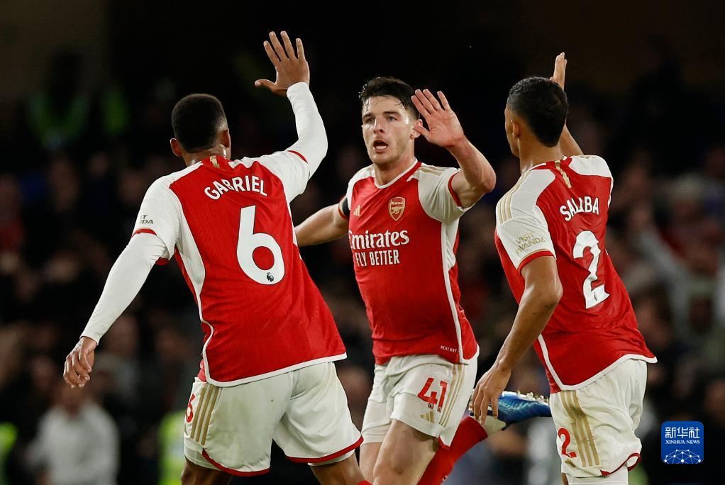 10月21日,阿森纳队球员赖斯(中)在进球后和队友加布里埃尔(左)、萨利巴庆祝。新华社/路透