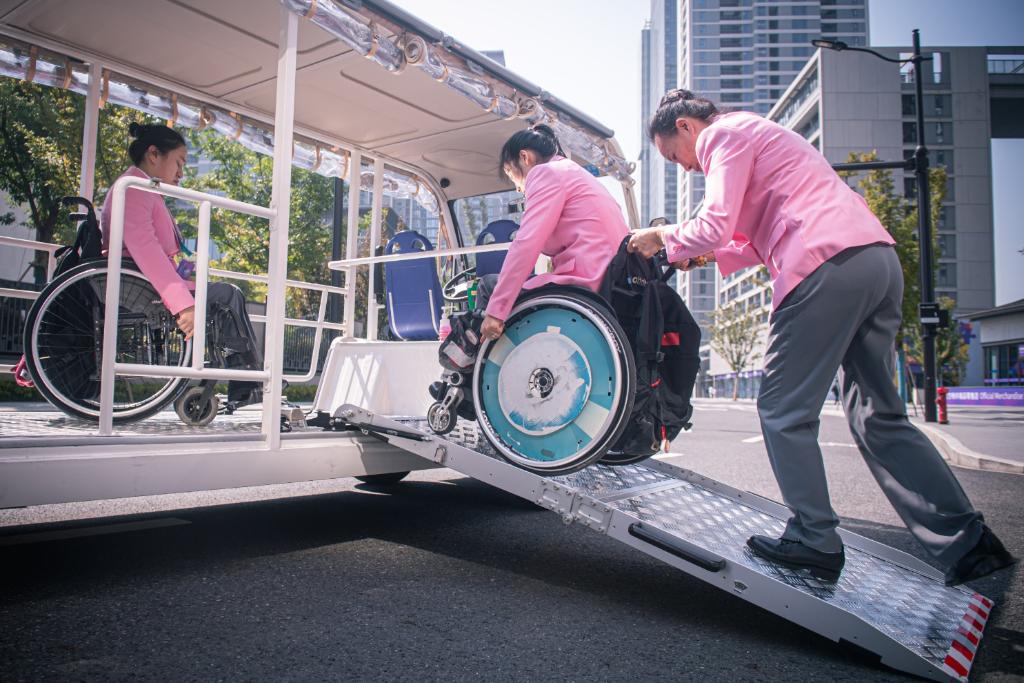 10月16日,中国体育代表团成员在杭州亚残运村内乘坐无障碍接驳车出行。新华社记者 江汉 摄