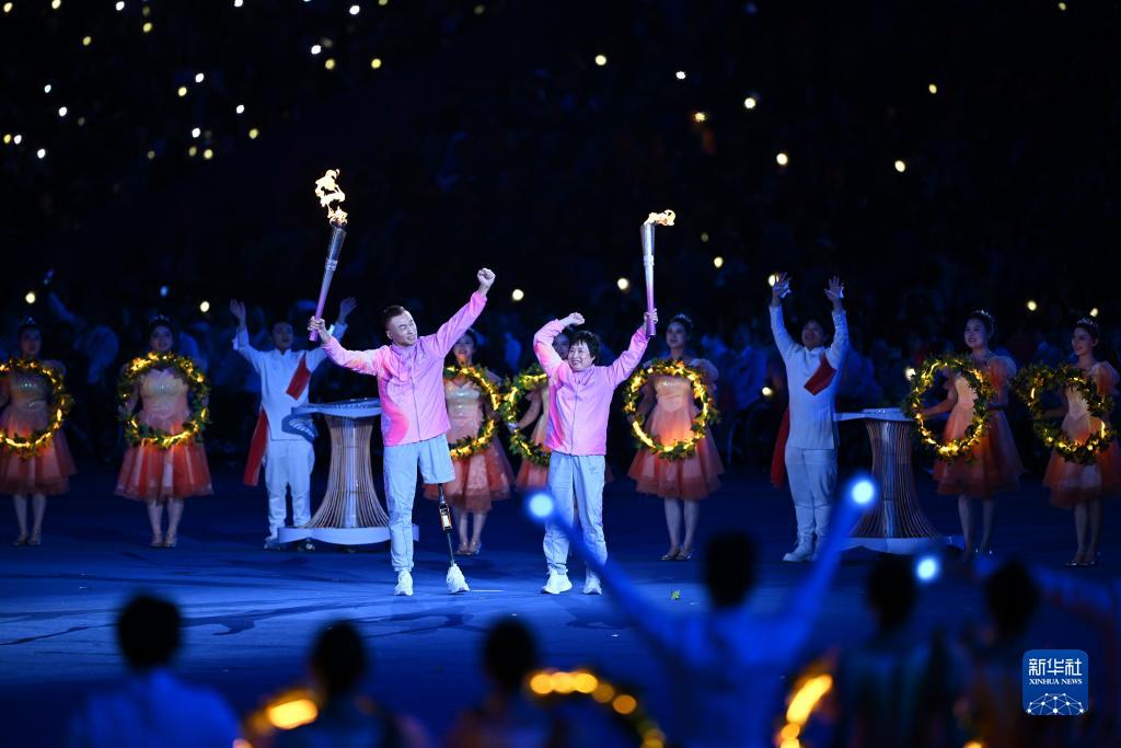 10月22日,火炬手郑雄鹰(右)与侯斌在开幕式上传递火炬。