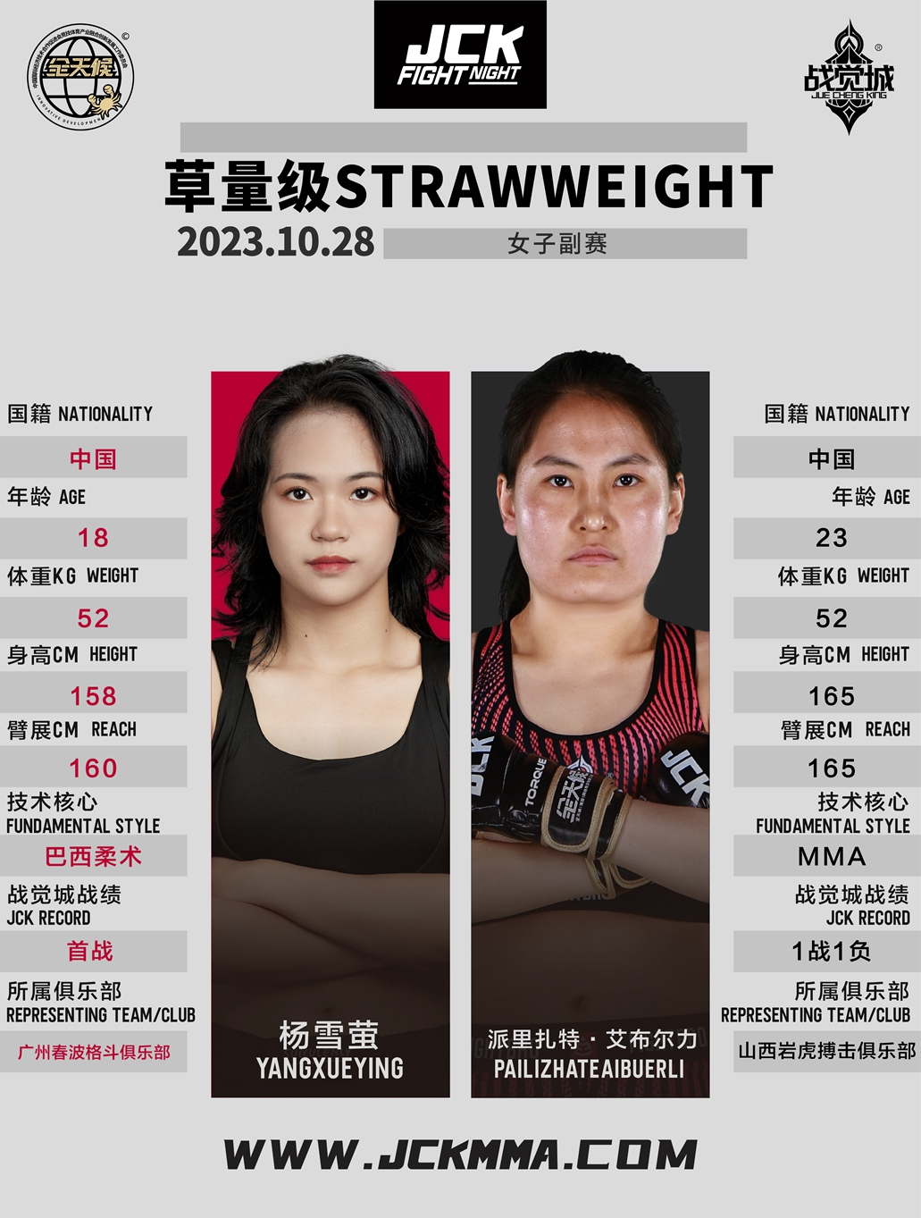 杨雪萤,年龄18岁,技术核心:巴西柔术,职业战绩:6战4胜,在2023年亚洲综合格斗锦标赛中获得一枚金牌。