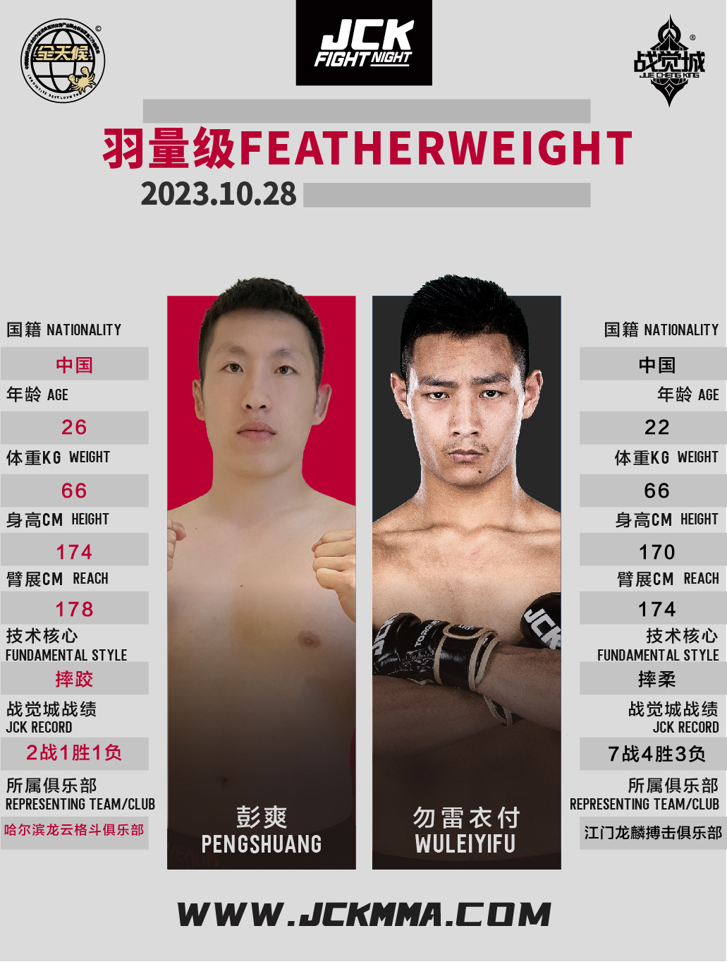 红方选手彭爽,年龄26岁,技术核心:摔跤,职业战绩:10战5胜,在JCK战觉城2战1胜。