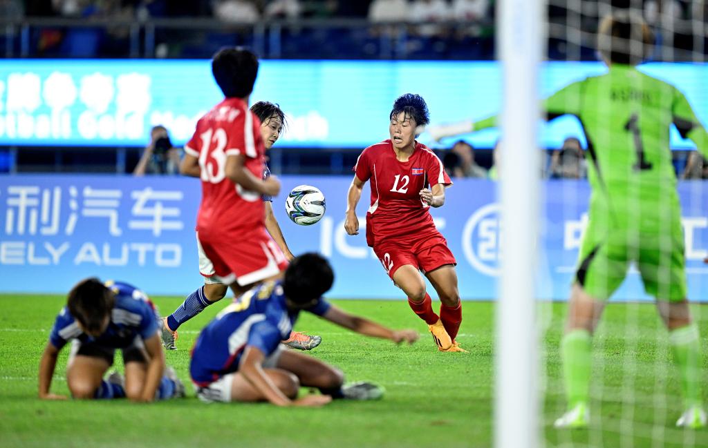 10月6日,朝鲜队球员催金玉(中)在杭州亚运会足球女子组决赛中。新华社记者 王鹏 摄