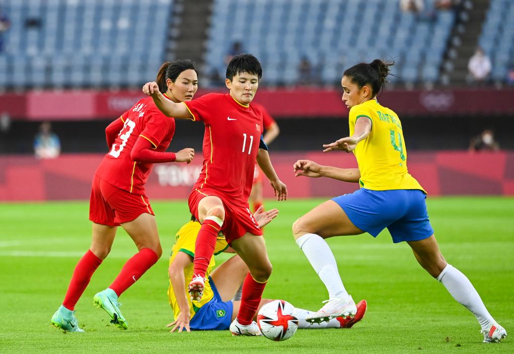 2021年7月21日,中国队球员王珊珊(中)在东京奥运会女足小组赛F组比赛中。新华社记者 逯阳 摄
