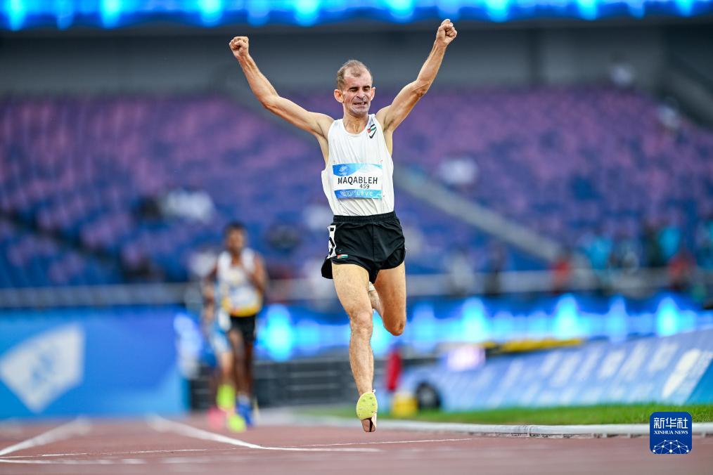 10月25日,约旦选手纳比尔·哈立德·艾哈迈德·马卡布勒在比赛中冲线,他以4分07秒50的成绩获得男子1500米T13级项目金牌。新华社记者 伍志尊 摄