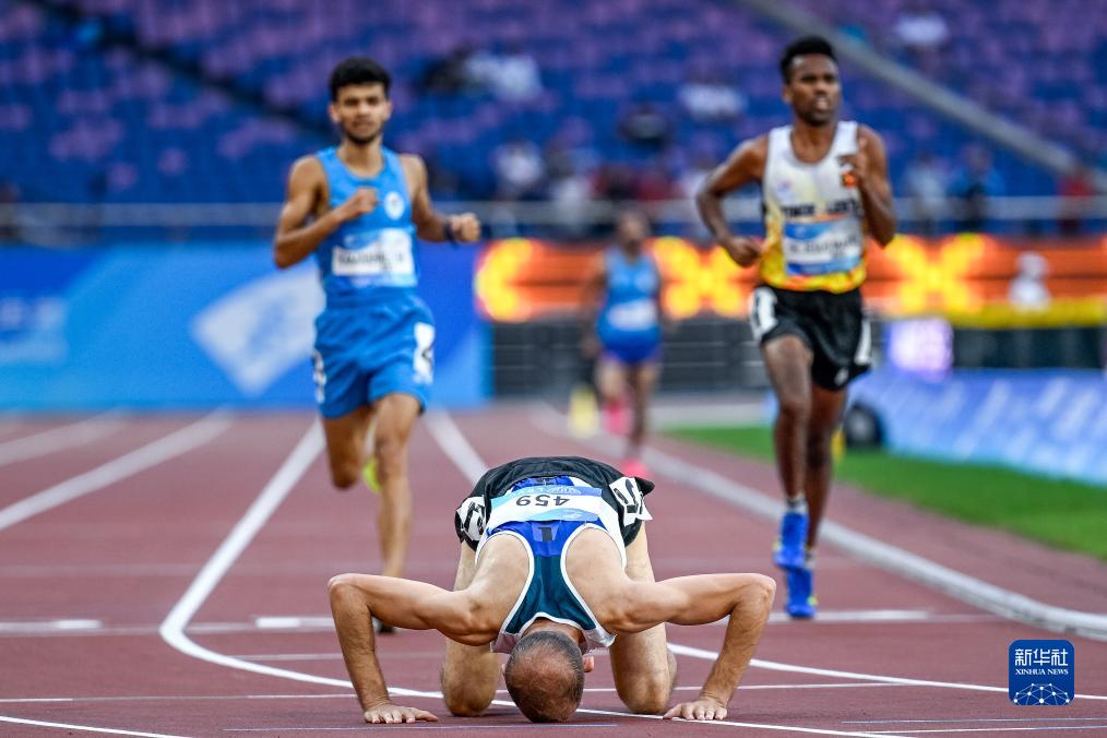 10月25日,约旦选手纳比尔·哈立德·艾哈迈德·马卡布勒在比赛后俯身亲吻赛道,他以4分07秒50的成绩获得男子1500米T13级项目金牌。新华社记者 伍志尊 摄