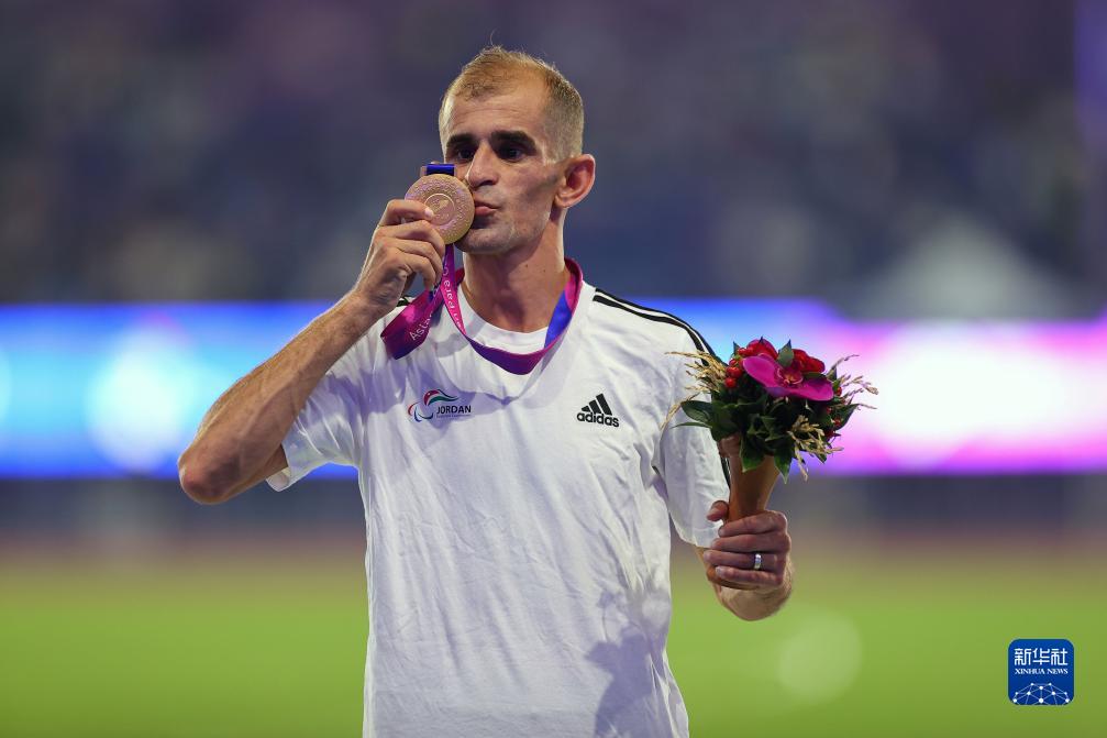 10月25日,约旦选手纳比尔·哈立德·艾哈迈德·马卡布勒在颁奖仪式上亲吻奖牌,他以4分07秒50的成绩获得男子1500米T13级项目金牌。新华社记者 杨植森 摄