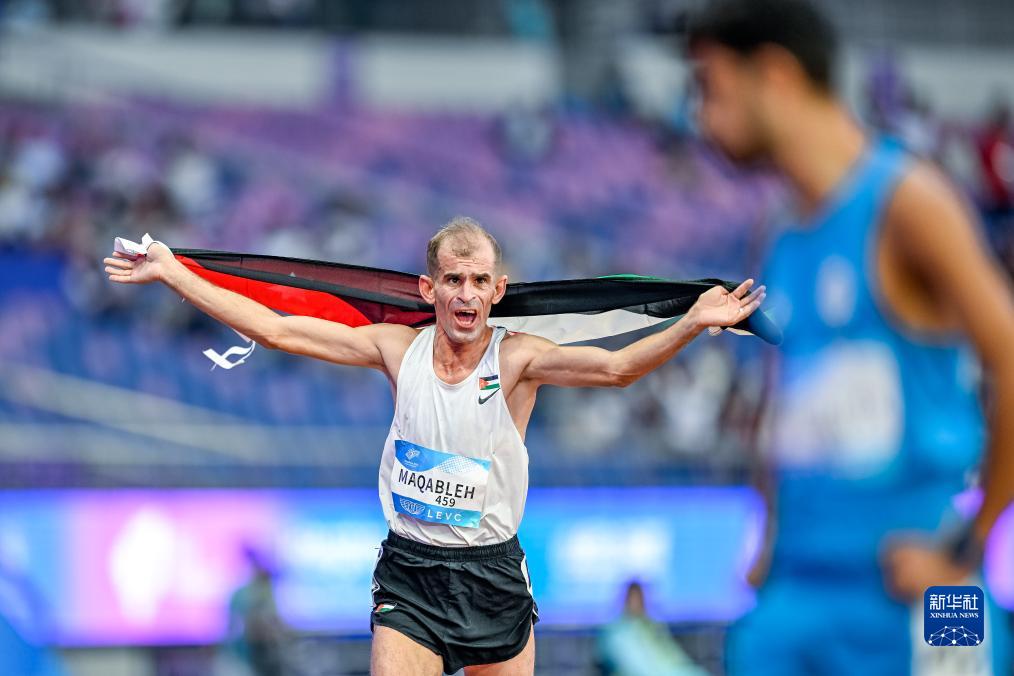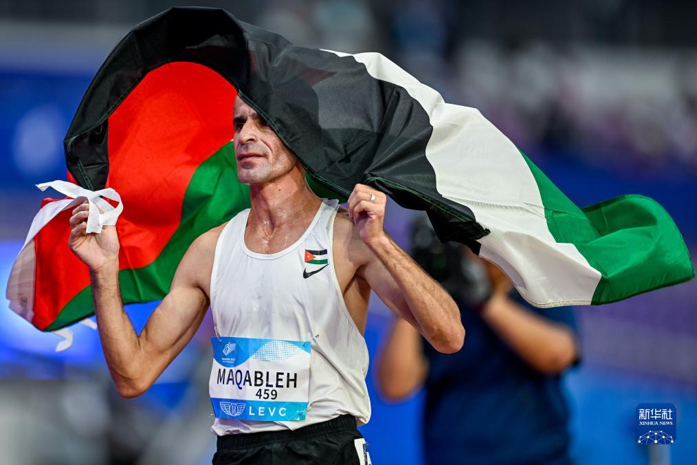10月25日,约旦选手纳比尔·哈立德·艾哈迈德·马卡布勒在比赛后身披国旗庆祝,他以4分07秒50的成绩获得男子1500米T13级项目金牌。新华社记者 伍志尊 摄