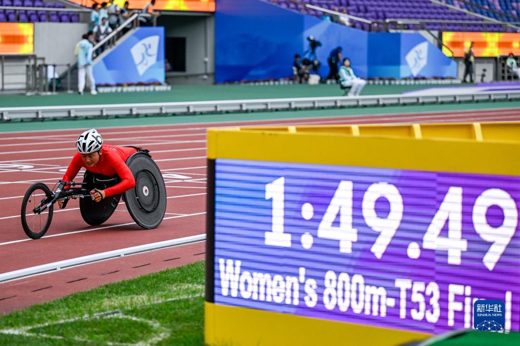 10月25日,中国选手周洪转在女子800米T53级决赛中冲线,她以1分49秒51的成绩获得该项目金牌。新华社记者 伍志尊 摄