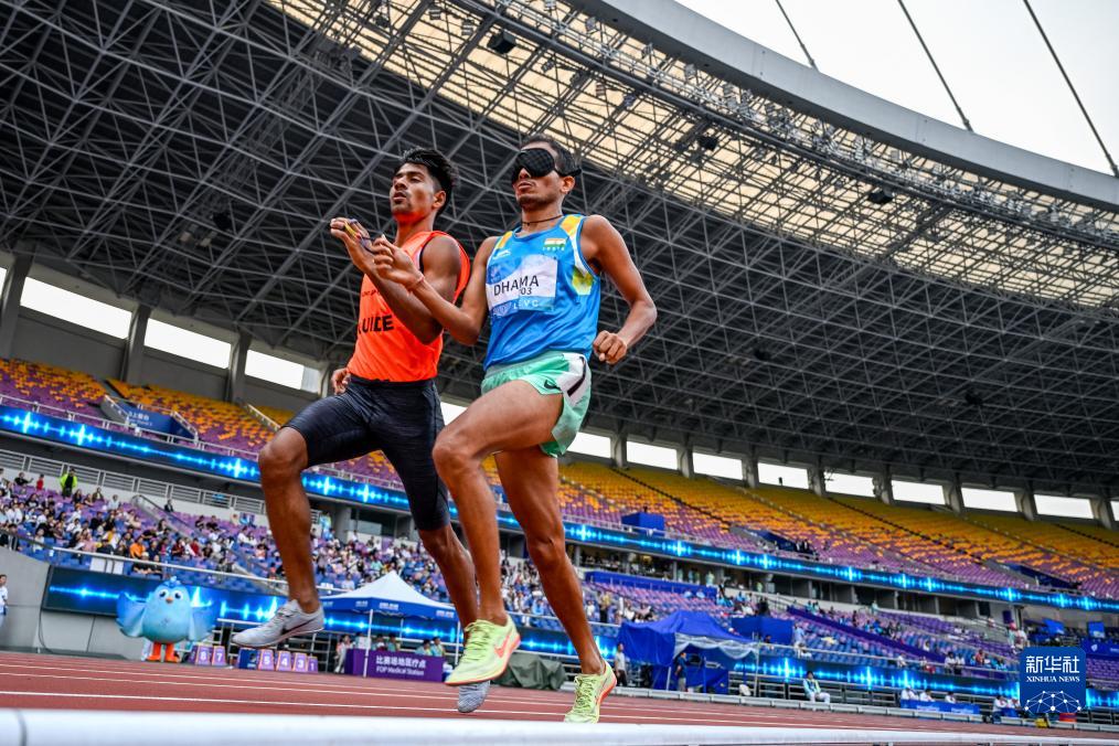 10月25日,印度选手安库尔·达马(右)和引导员古尔贾在男子1500米T11级决赛中。达马以4分27秒70的成绩获得该项目金牌。新华社记者 伍志尊 摄