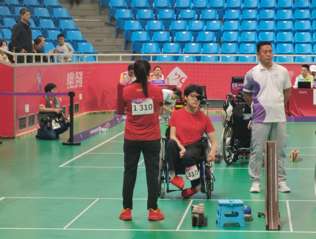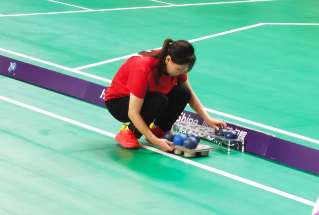 硬地滚球是最具包容性的残疾人运动之一,专门为脑瘫患者、严重躯体功能障碍的运动员而设立。其根据运动员残疾程度分为4个级别,杨贝贝属于其中较重的级别,无法独立掷球,因此需要轨道器械和竞赛辅助人员的帮助。