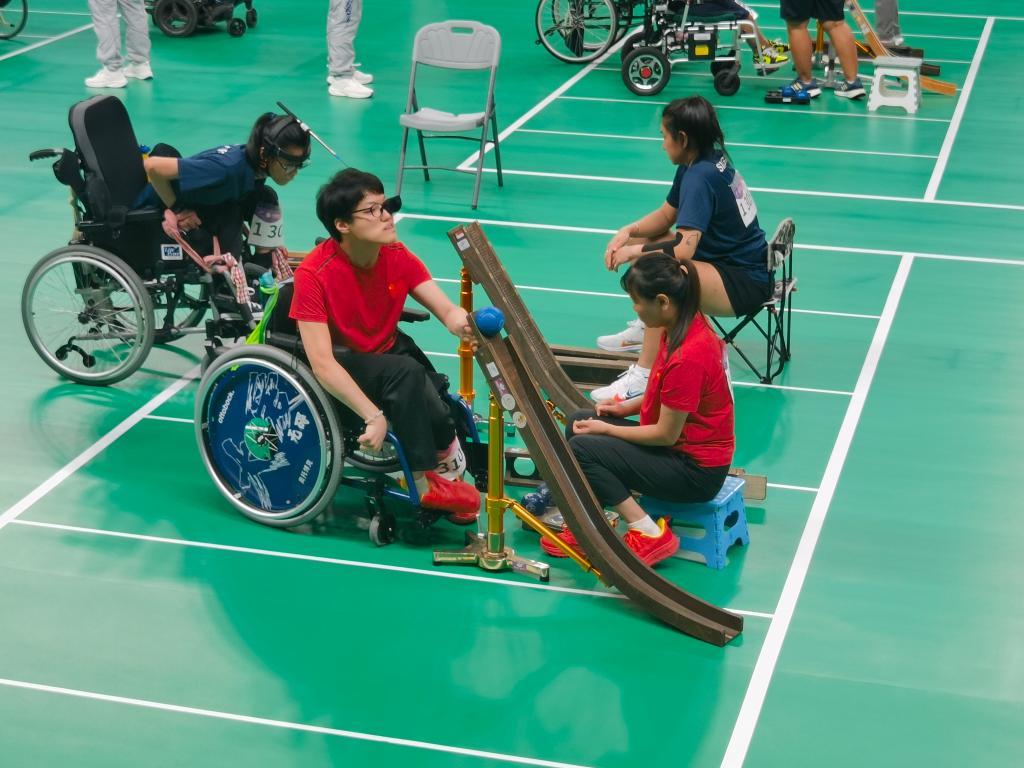 硬地滚球是最具包容性的残疾人运动之一,专门为脑瘫患者、严重躯体功能障碍的运动员而设立。这项运动的规则与冰球较为相似,双方各执六枚不同颜色的球,谁投出去的球最终距离目标白球的距离最近,就会赢得积分。对于杨贝贝来说,赛场上需要时刻保持清醒的头脑,根据场上局势部署球路,还需要精准“控制”轨道和出球点,才可以每一次投球都能有效。