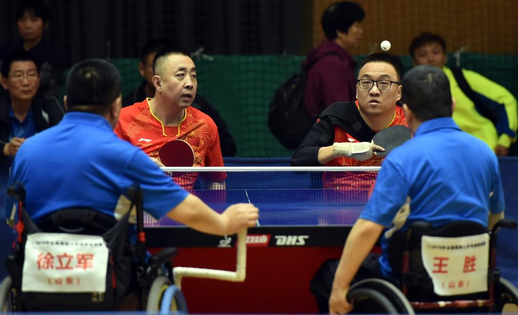 2018年全国残疾人乒乓球锦标赛,辽宁队选手高延明/于忠涛(后,右)在男子双打TT4级别比赛中。新华社发(李嘉南摄)
